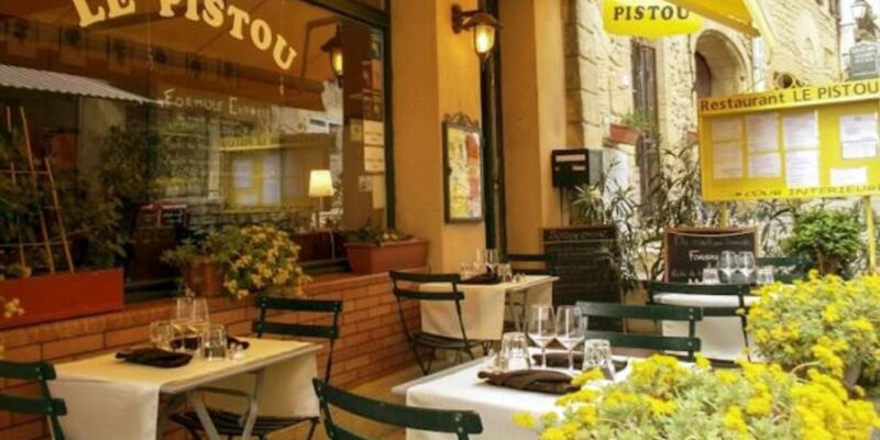Le Pistou sits in a village defined by vineyards, cobbled streets, and soft evening light.